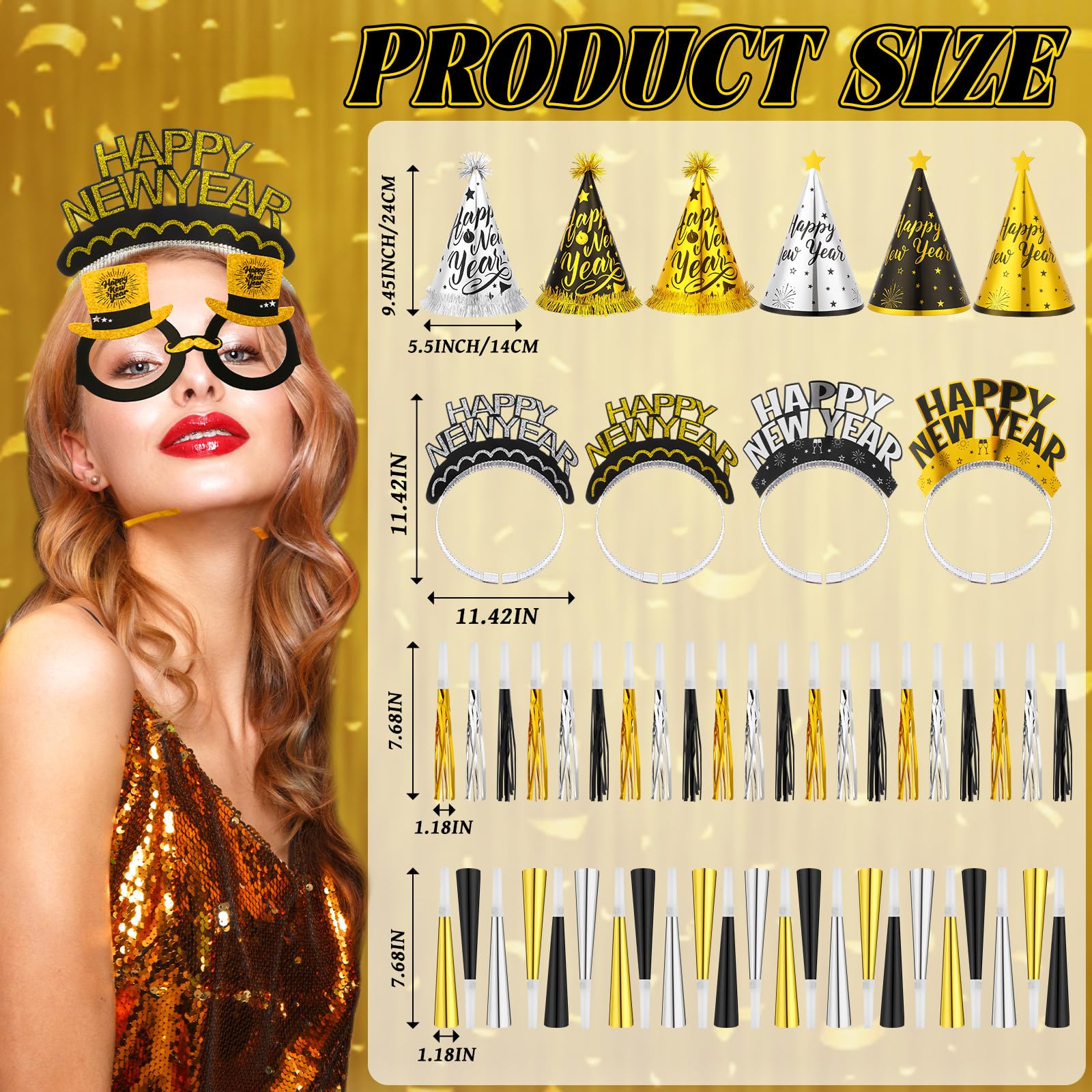 - 2026 New Year Party Accessory: elevate your party with our complete New Year Eve party supplies 2026 kit; You get 24 pieces of party hats, 24 pieces of "Happy New Year" headbands, 24 metallic tassel noisemakers, 24 party horns, and 24 adult paper eyeglasses; A total of 120 pieces are designed to make your party dazzling and captivating; They are suitable for your New Year decoration needs in 2026, bringing you unforgettable celebration events