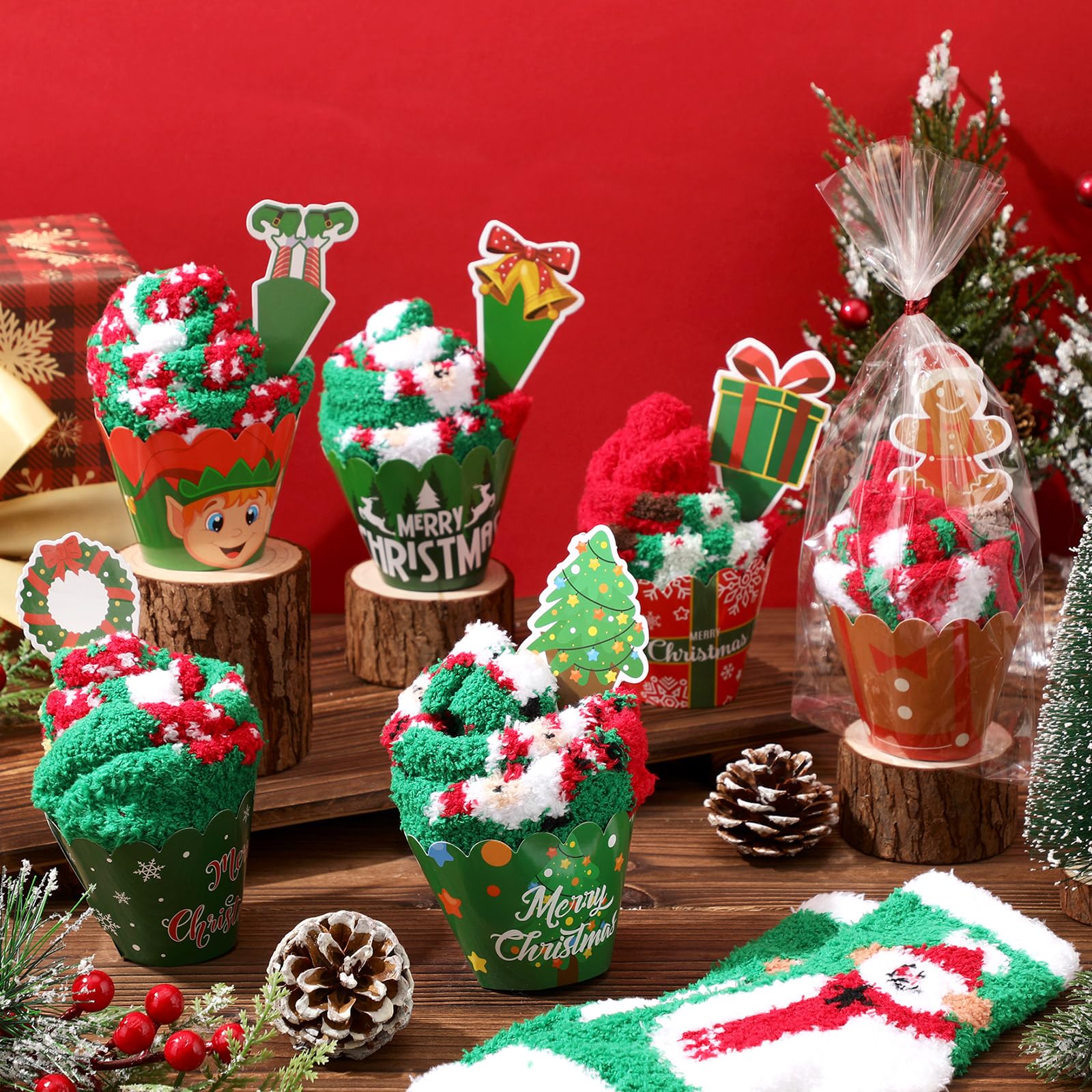 - Convenient Package for Christmas: the package includes 24 pairs of fluffy warm socks in 8 styles, 24 pieces of Christmas cupcake toppers wrappers in 12 styles and 24 pieces of clear plastic gift bags with ties in red, abundant in quantity and nice in combination, satisfying your needs for Christmas