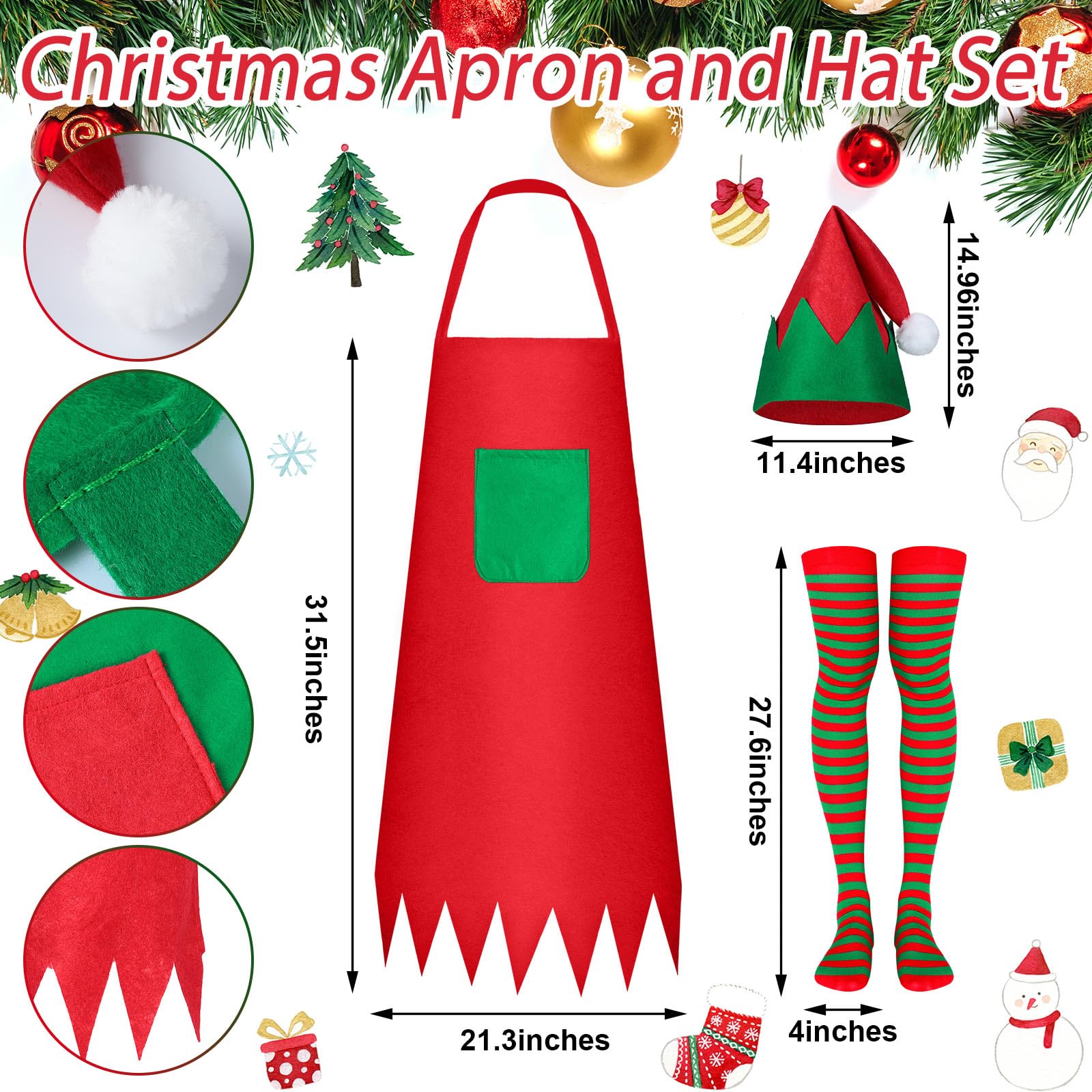 - Christmas Elf Set: you will get 12 pieces of elf aprons, 12 pieces of elf hats and 12 pairs of red and green striped socks, total red color 6 set,green color 6 set,enough to meet your holiday cosplay needs, and you can also share them with your good friends
