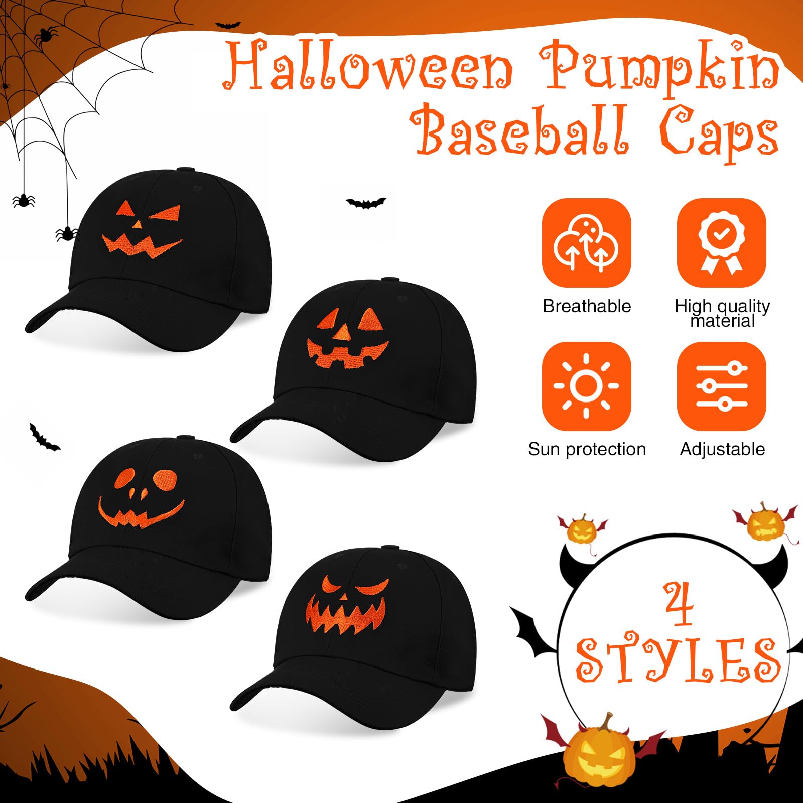 - Different Style: express your Halloween style with our set of 4 Halloween pumpkin baseball caps, featuring different embroidered expressions on the hat tops; This product is only suitable for over 14