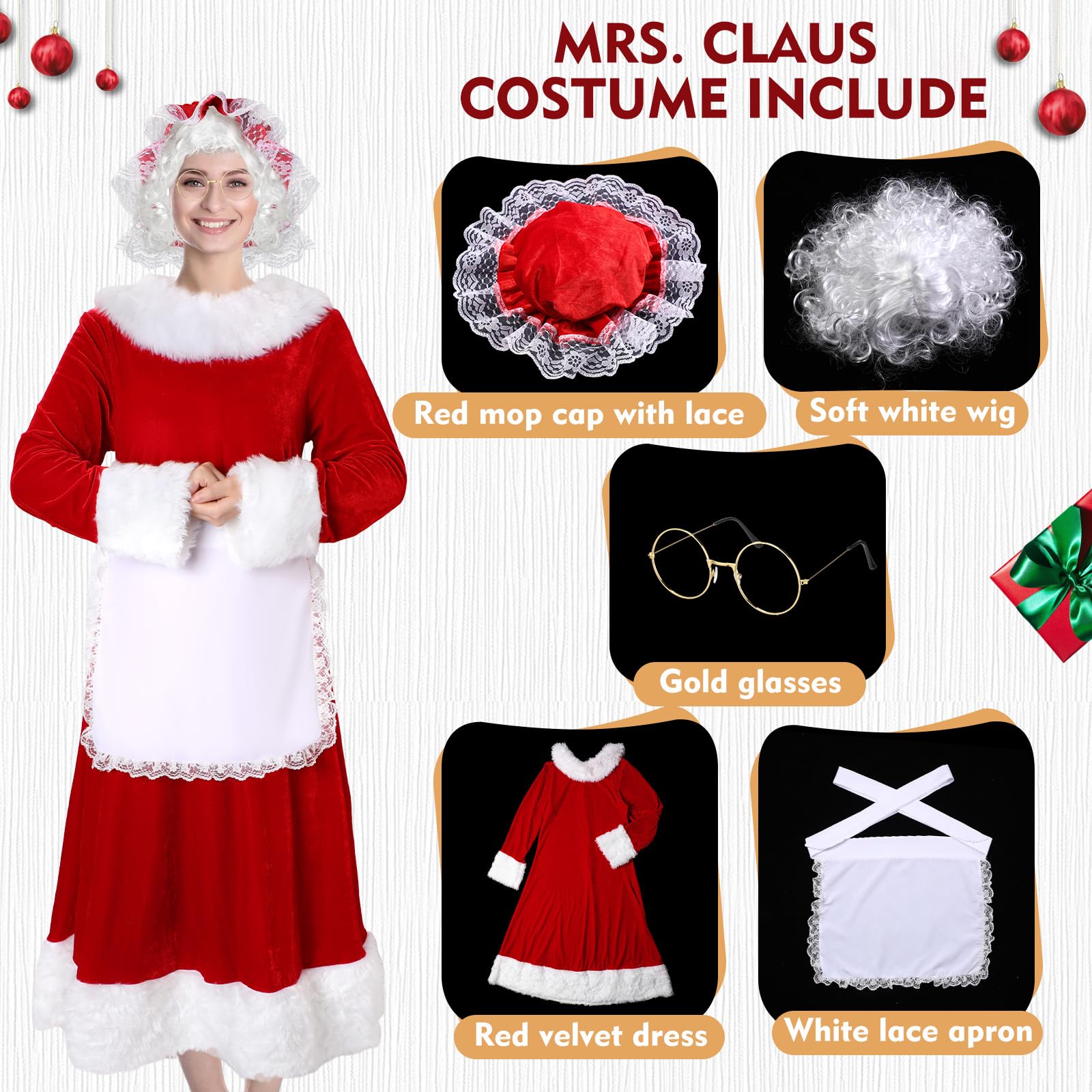- Claus Costume for Women: dress up in the Christmas costumes for women featuring 1 red velvet dress, 1 white apron with lace trim, 1 hat, 1 curly white wig, and 1 wire rim glasses; Ideal for adding a touch of elegance to your holiday celebrations
