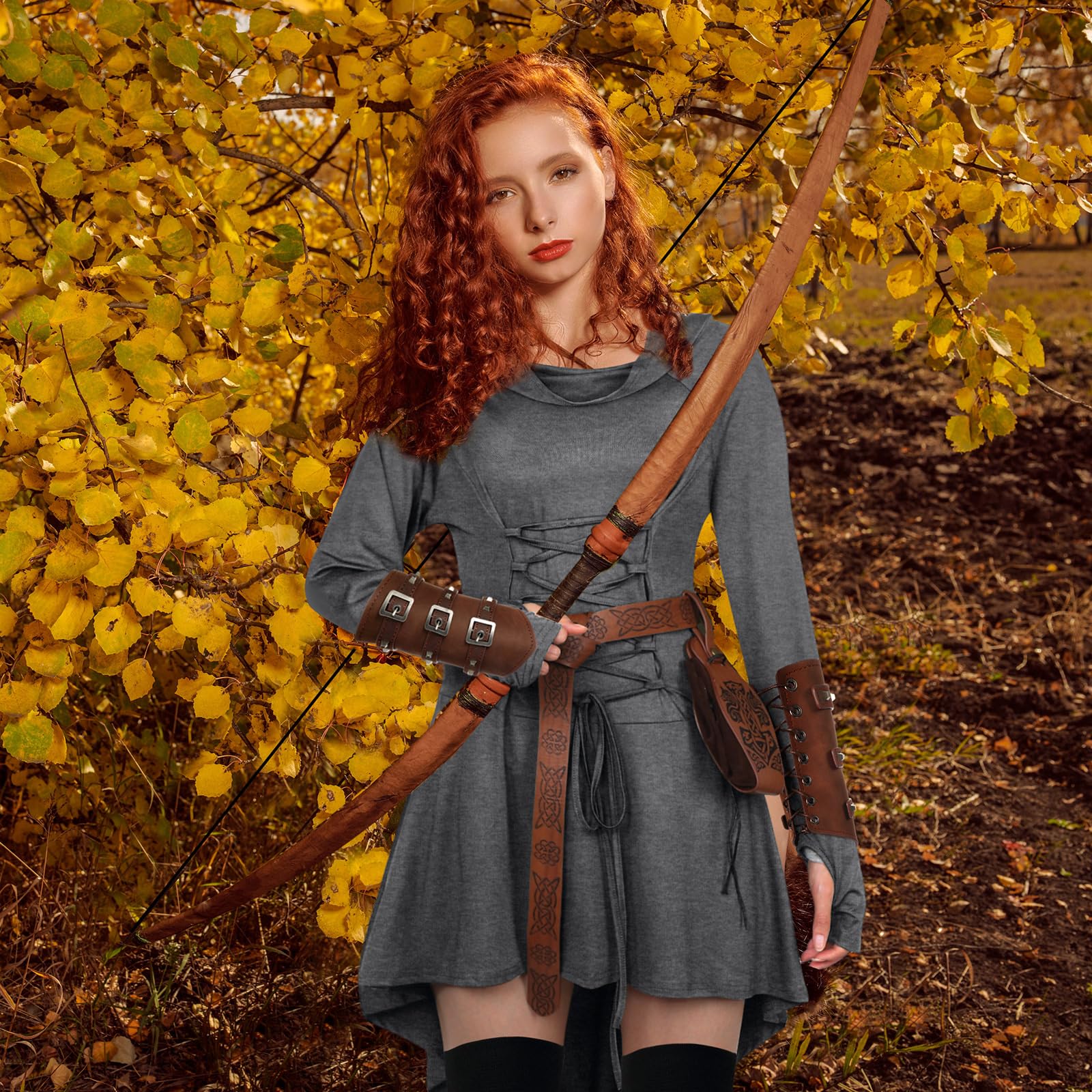 - Package Content: the costume set comes packed with what most of you need for a complete renaissance look, included in the package is a hoodie renaissance cloak, a pair of buckle wrist guards, a medieval knight's belt, a pouch, and a pair of knee high socks, adding attractiveness and charm for you