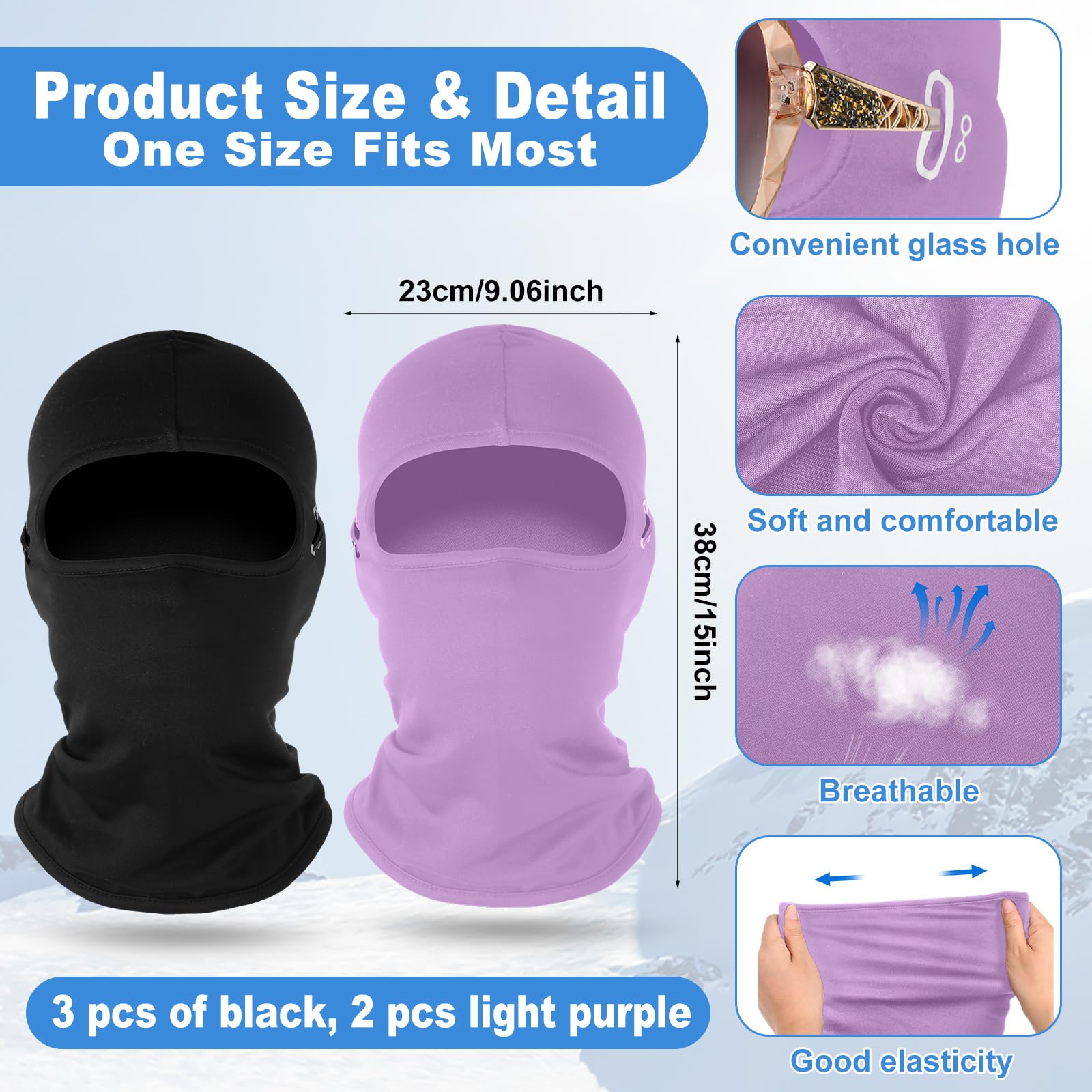 - Ample Quantity: you will get 5 pieces of quality balaclavas, 3 of black and 2 of light purple; Having multiple masks on hand means you can keep clean ones ready to use or share with family and friends; Enjoy a group skiing trip or outdoor adventure with every member kitted out in quality, comfortable face protection