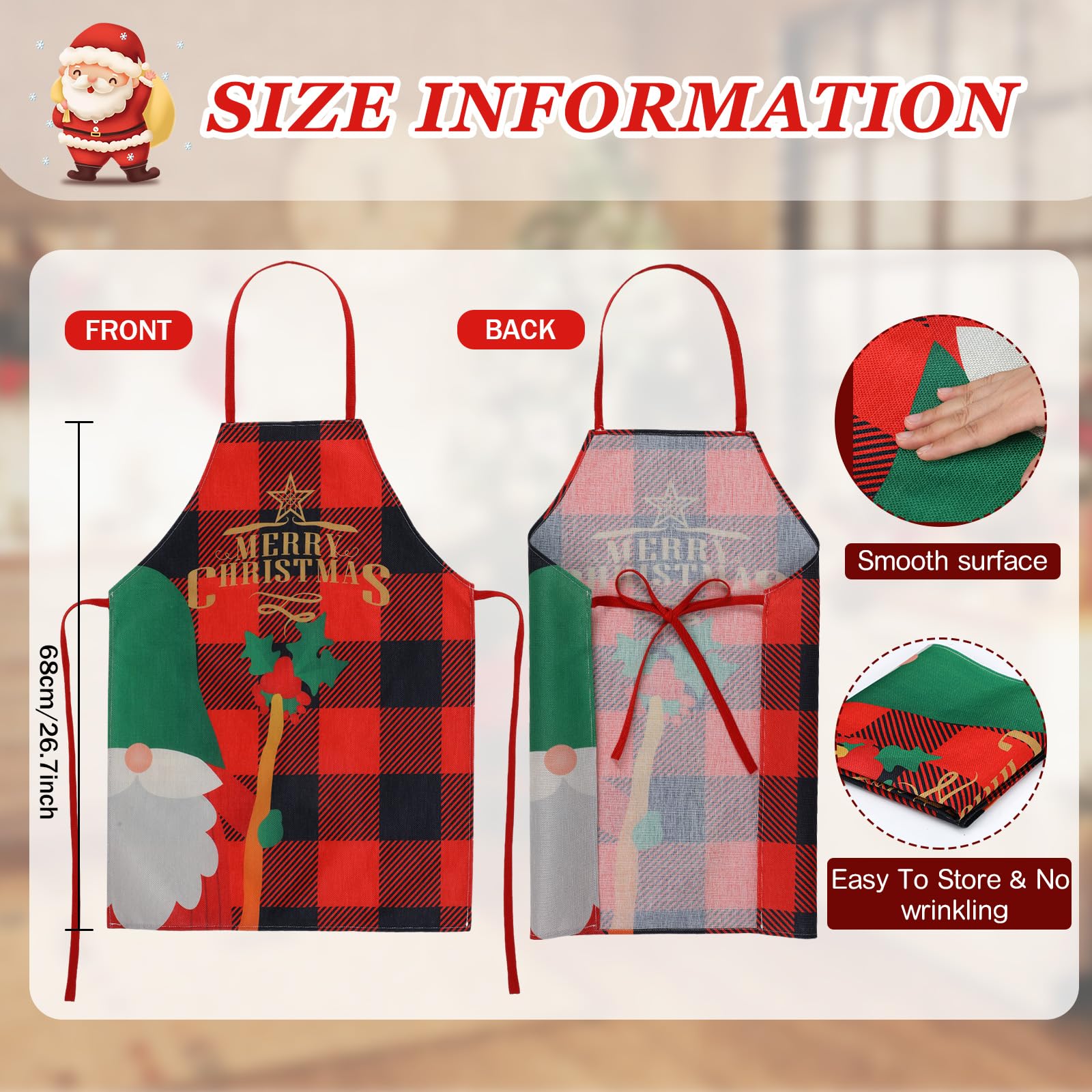 - One Size Fits All: adults kitchen baking apron is about 26.7 x 21.7 inches/ 68 x 55 cm, suitable for most women and men; You can easily put on and take off this holiday apron, easy to store and fold; Our Christmas red plaid aprons add a touch of holiday decor to most occasions